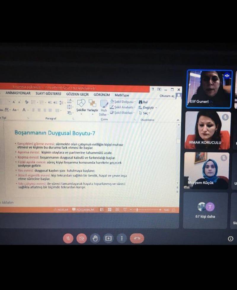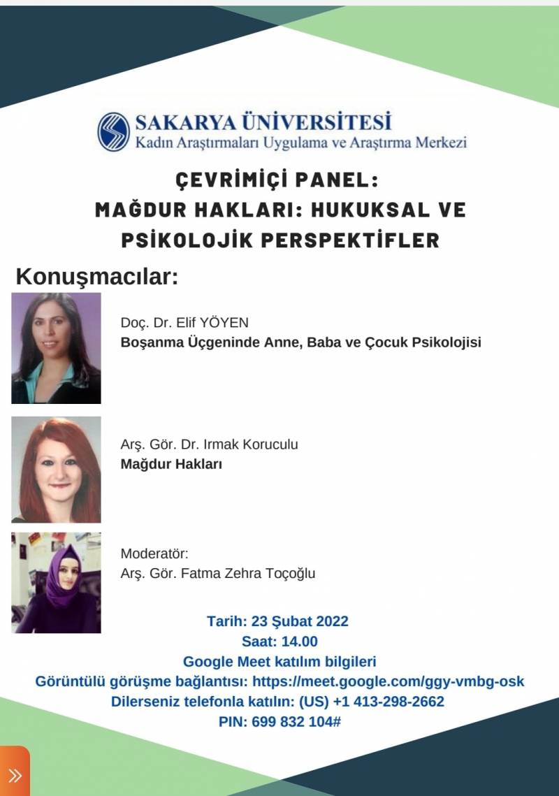 Sakarya Üniversitesi Kadın Araştırmaları Uygulama ve Araştırma Merkezi'nin düzenlediği Mağdur Hakları: Hukuksal ve Psikolojik Perspektifler çevrimiçi panelinde bölümümüz öğretim üyelerinden Doç. Dr. Elif Yöyen, "Boşanma Üçgeninde Anne, Baba ve Çocuk Psikolojisi" konulu sunumuyla konuşmacı olarak yer aldı.