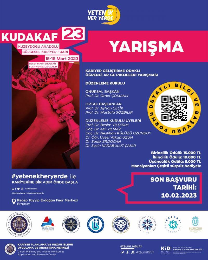 Kuzeydoğu Anadolu Bölgesel Kalkınma Fuarı (KUDAKAF'23) kapsamında "Kariyer Geliştirme Odaklı Öğrenci ARGE" projeleri yarışması düzenlenecektir.